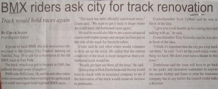 ~ A Pump Track Replaces The Old BMX Track In Quincys East Park.The Quincy Pump Track is easy to find,The Quincy Pump Track is located at the Quincys East Park at the east end of town, "just north of the swimming pool", baseball fields. There is no cost to use the pump track. ![]() Photo: - A Air View Of The Quincy East Park Pump Track. * YouTube Videos Playlist:- Quincy BMX Pump Track - Quincy, Washington USA. * Pump Track Event Brings Out Families, Riders To Test Their Skills. Quincy, Washington USA -- 08/16/2023 One by one, riders on a variety of vehicles, with two, three or four wheels, took off from the elevated launch pad Aug. 8 in Quincys East Park to test their skills on the citys pump track. It was the citys second event held at the track, organized to time riders on selected routes through the pump tracks maze. The track opened last year and offers a network of asphalt paths that twist and turn, and rise and fall, for a thrilling chance to build riding skills, whether on a bicycle, scooter or skateboard. The city replaced an old dirt bicycle track in the eastern corner of East Park with a pump track thanks in large part to Evergreen Mountain Bike Alliances Central Washington Chapter. That group provided expertise for design and a lot of the labor for construction. Tony Hickok, president of the Central Chapter, said at the August 2022 event the Quincy pump track is one of the largest in the state and the largest in the central Washington area. * City, Pump Track Fans Celebrate New Way To Have Fun. Quincy, Washington USA -- 08/31/2022 Quincys new pump track got a grand opening event Thursday, bringing out families with bicycles – and at least one scooter – to celebrate the new recreational amenity in the citys East Park. The pump track has been open since end of June. Its open when the parks open, so anybody can come out here anytime, A group worked with the city of Quincy to create the track, replacing a smaller worn-down BMX track on the site. * Pumping Up The Fun. Quincy, Washington USA -- 05/18/2022 Q: What is special about this track, its design or features? What about it will be a lot of fun for riders? A: Its large size is what makes it special. I haven’t done the research yet. But I suspect this is the largest pump track in the state. Speed will be the fun factor. As riders skills improve the track will ride very fast. About half of the paths of the new pump track in Quincys East Park had been paved as of Friday May 13th. * Quincys New Pump Track Takes Shape, Gets Paved. Quincy, Washington USA -- 05/18/2022 About half of the pump track paths were paved with asphalt last week. Paving was to continue Monday. When it opens to the public, the pump track is expected to become an attraction for experienced bicyclists as well as younger, smaller children on bikes and scooters. An opening date had not been set. The paved track will not wear down like the dirt track at the old BMX course did. A BMX track is designed to pedal and sprint at features (jumps and rollers) and turns. A pump track is best ridden without pedaling. Your forward momentum is created by pumping your bike through the rollers and features. * New Track Taps Into A Popular Biking Trend. Quincy, Washington USA -- 03/09/2022 The East Park Pump Track will replace the old BMX track in Quincys East Park. The idea is to build the track this spring, and volunteers are welcome to help. City workers have already begun clearing the site. A month ago, they removed the thick concrete pad that was at the top of the starting mound of the former BMX track The pump track will provide a different riding experience. The track will be paved and have more features. * Quincy City Council Gets Update On Bike Track Project. Quincy, Washington USA -- 03/09/2022 The East Park Pump Track concept took another step toward becoming reality with a long presentation and discussion at Quincy City Councils meeting on March 1. Parks planning, stood and facilitated a discussion about the pump track, which is planned to replace the old BMX track in Quincys East Park. He showed slides on the several screens around the council chamber. Council was shown design concepts for the new bike track. _______________________________________________________________ _______________________________________________________________ The Quincy BMX Track is located at the Quincys East Park at the east end of town, "just north of the swimming pool", baseball fields, next to the - Quincy Skate Park. There is no cost to use the bmx track. The Quincy BMX track was constructed in the 1980's. Quincy BMX track was ABA sanctioned in the 1980`s, Today, the track, still inplace, It just sits, with the area youth play riding on the track. The track - a challenging track layout with a nice starting gate and some jumps and turns for improving your riding skills. In todays bmx world, the track is known as an old-school bmx track and played a good roll in the Washington state BMX history. It would be nice if someone would step up and help run the bmx track today. The Quincy bmx track looks like its comming along, but needs lots of work. The kids would love it! _______________________________________________________________ Photos Of The Quincy BMX TrackPhotos by Geneb - Gene`s BMX.com 09-15-2005![]() ( Click On Photo For More Photos! ) ___________________________________________________________________ Quincy BMX Track Seeking RestorationQuincy, Washington -- 08/18/2005~City hears from teen seeking BMX track restoration~ The city council heard from 16-year-old Bill Crane of Quincy who suggested that the city restore its BMX bike track back to its original condition. He said that competitions were once held there that brought riders from Moses Lake, Wenatchee and other areas to Quincy. The council and Mayor Dick Zimbelman agreed that it would be valuable to the city and also give young people something positive to do. "We don't even have a theater in this town," Councilmember 